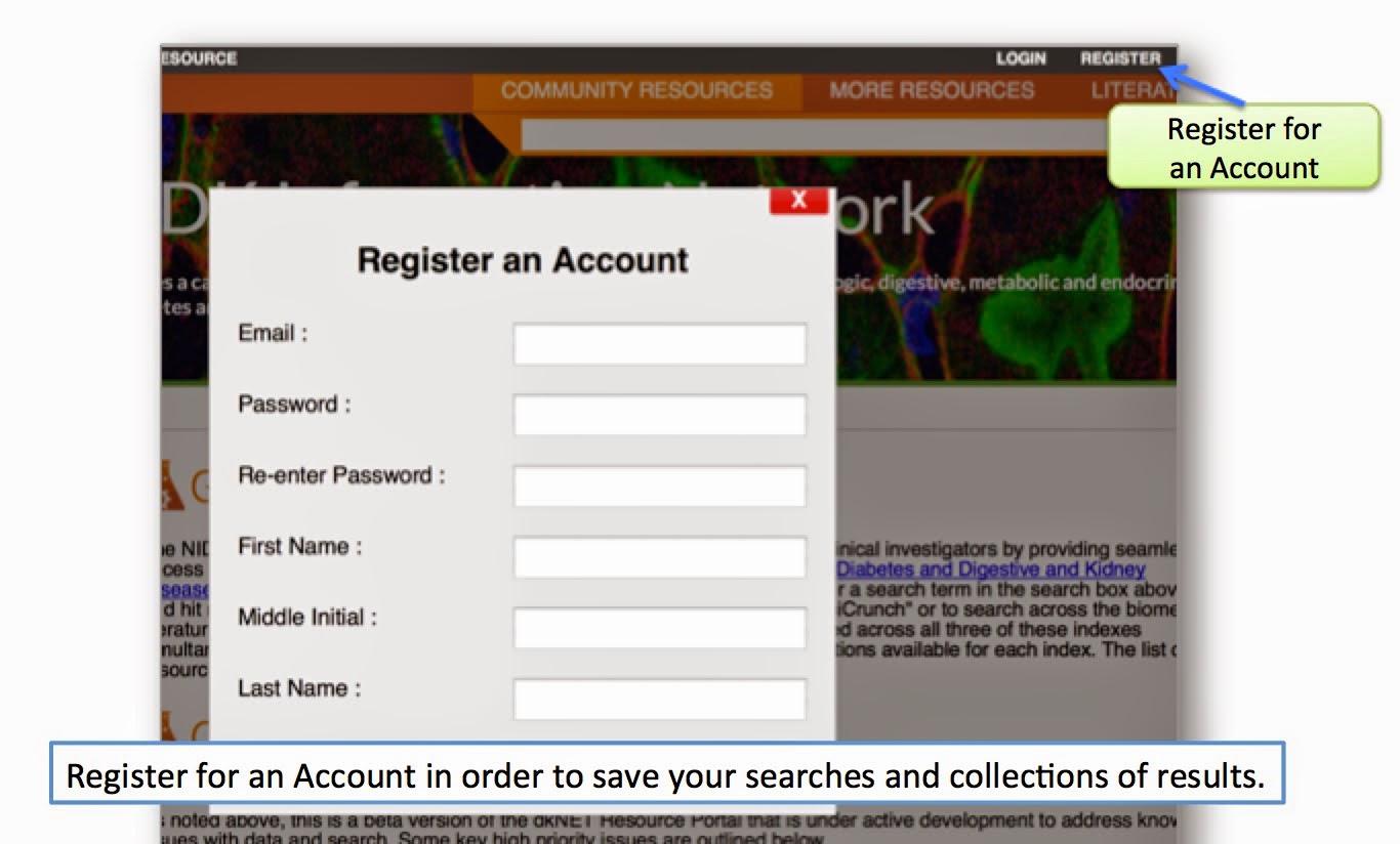 With this release of dkNET, you can now save your search parameters. To start with, you'll need an account on dkNET. Simply go to dkNET and click on the Register link. The only fields needed are your name and email so registering for an account is quick and easy to do.